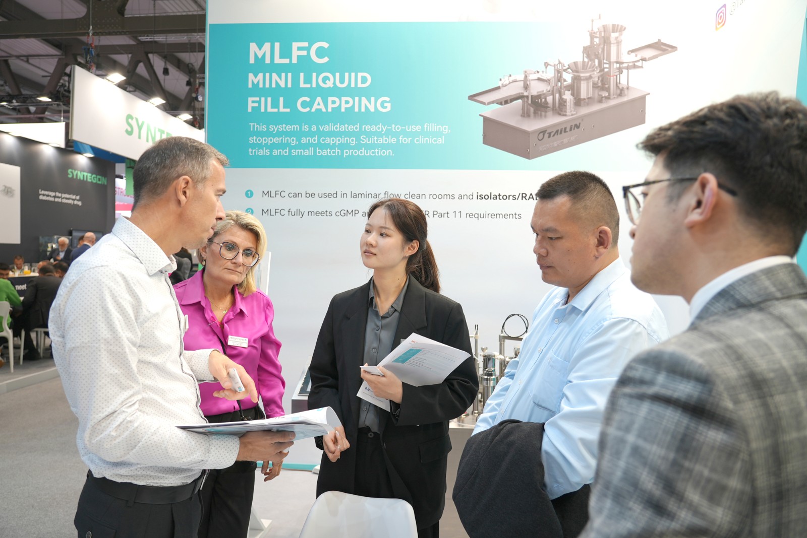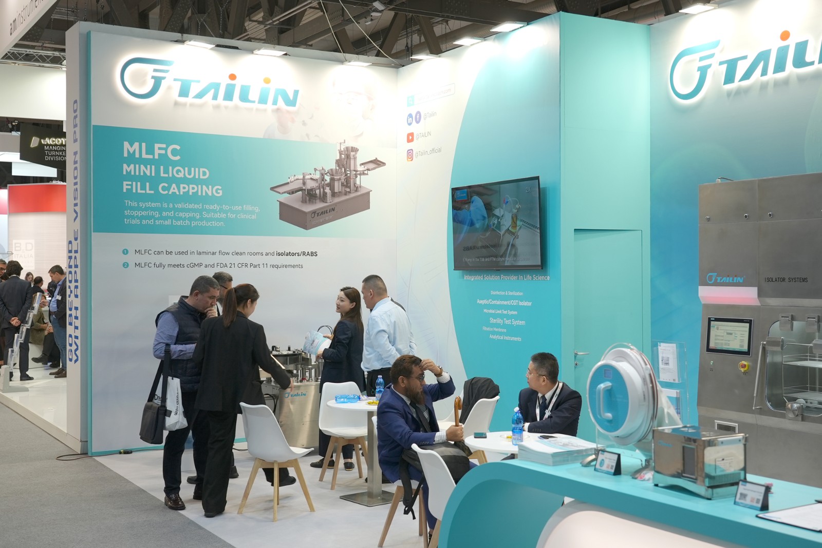泰林生物作為生命科學(xué)領(lǐng)域“創(chuàng)新研發(fā)”和“新質(zhì)生產(chǎn)力”的代表,攜其旗艦產(chǎn)品無菌檢查隔離器、手套完整性測(cè)試儀、全自動(dòng)菌落計(jì)數(shù)系統(tǒng)、智能集菌儀、微生物檢驗(yàn)儀、濾芯測(cè)試儀等產(chǎn)品亮相,為行業(yè)呈現(xiàn)了一場(chǎng)數(shù)智科技場(chǎng)景成果盛宴。此次在海外展會(huì)首次璀璨亮相的微型液體灌裝機(jī),以其卓越的即用型灌裝加塞軋蓋系統(tǒng)ML FC,成為了全場(chǎng)矚目的焦點(diǎn)。MLFC極致縮小尺寸,以適合隔離器化趨勢(shì),滿足客戶在C級(jí)背景環(huán)境進(jìn)行無菌灌裝的需求。泰林生物依托數(shù)智科技,創(chuàng)新運(yùn)用自動(dòng)化、AI等新興技術(shù),深入挖掘用戶需求,打造出全場(chǎng)景全流程自動(dòng)化、數(shù)智化解決方案,滿足生命科學(xué)與高端裝備高質(zhì)量發(fā)展要求。